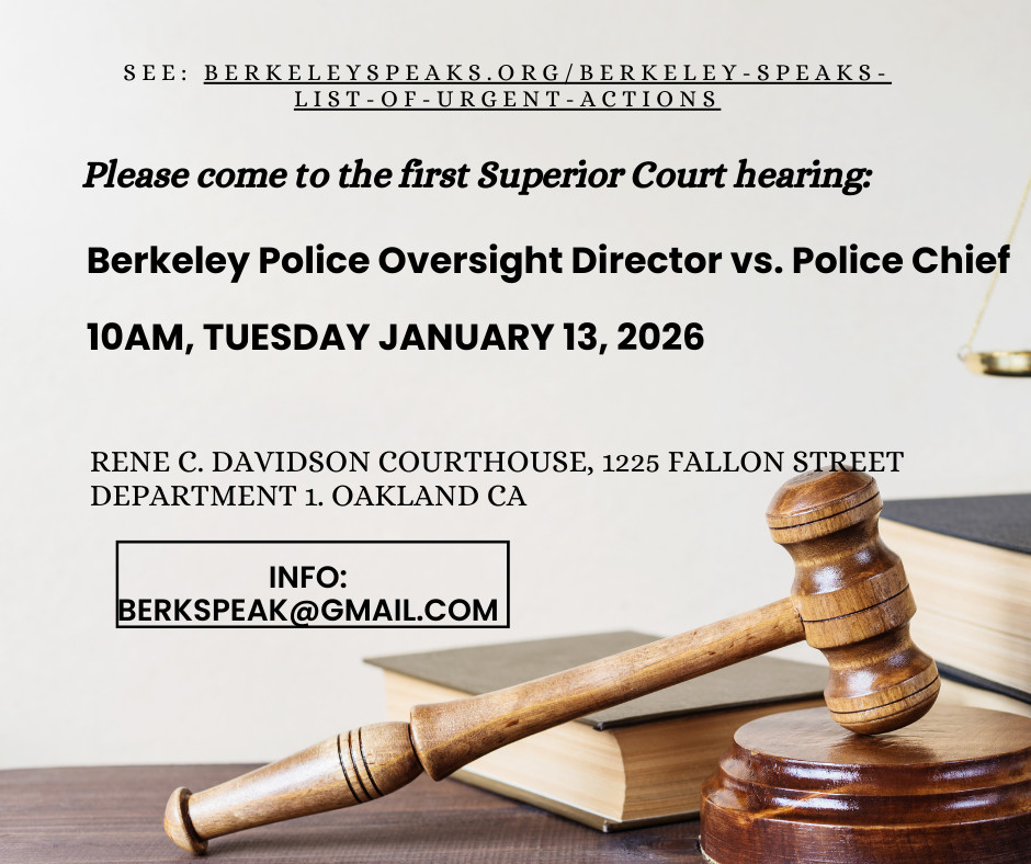 - Tuesday Jan. 13 at 10am, first hearing in the lawsuit by the Director of Police Accountability against the Berkeley Police Chief. See the Facebook event for Tuesday’s hearing here.