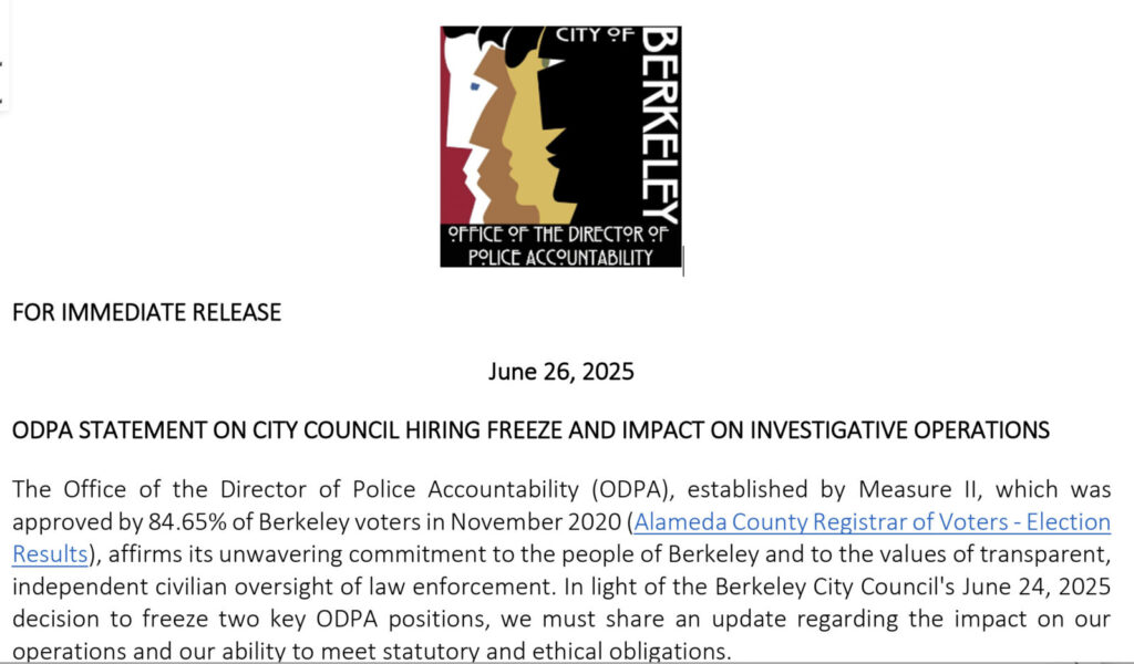 In light of the Berkeley City Council’s June 24, 2025 decision to freeze two key ODPA positions….the ODPA will recommend the administrative closure of ten (10) active personnel misconduct complaints….