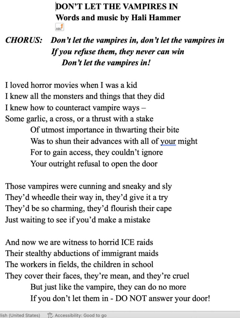 Don’t Let the Vampires InVol. III Edition 1Refugees and ImmigrantsNovember 15, 2025 Words and Music by Hali Hammer See the video of “Don’t Let the Vampires In:” https://youtu.be/ndyy-eqIwPg ! “Don’t Let the Vampires In” Credit: Hali Hammer AOC advises: “Do Not Open Your Door.” Credit: New York Post