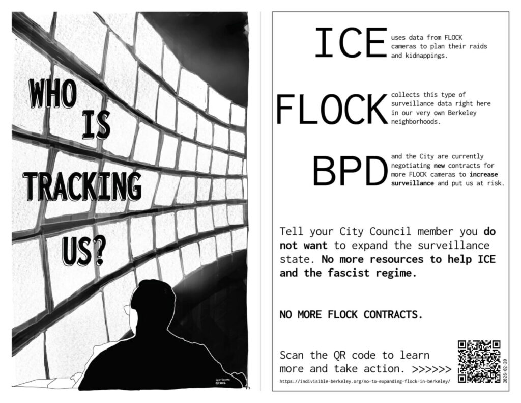 - Berkeley Speaks‘ article “Stop Local Collaboration with Immigration” from Fall 2025 summarizing the history of the struggle over the Flock contracts, including the city’s Sanctuary policies, Flock’s history of allowing ICE access to local data (including Berkeley’s), the drone proposal, and other local examples of collaboration with ICE.
